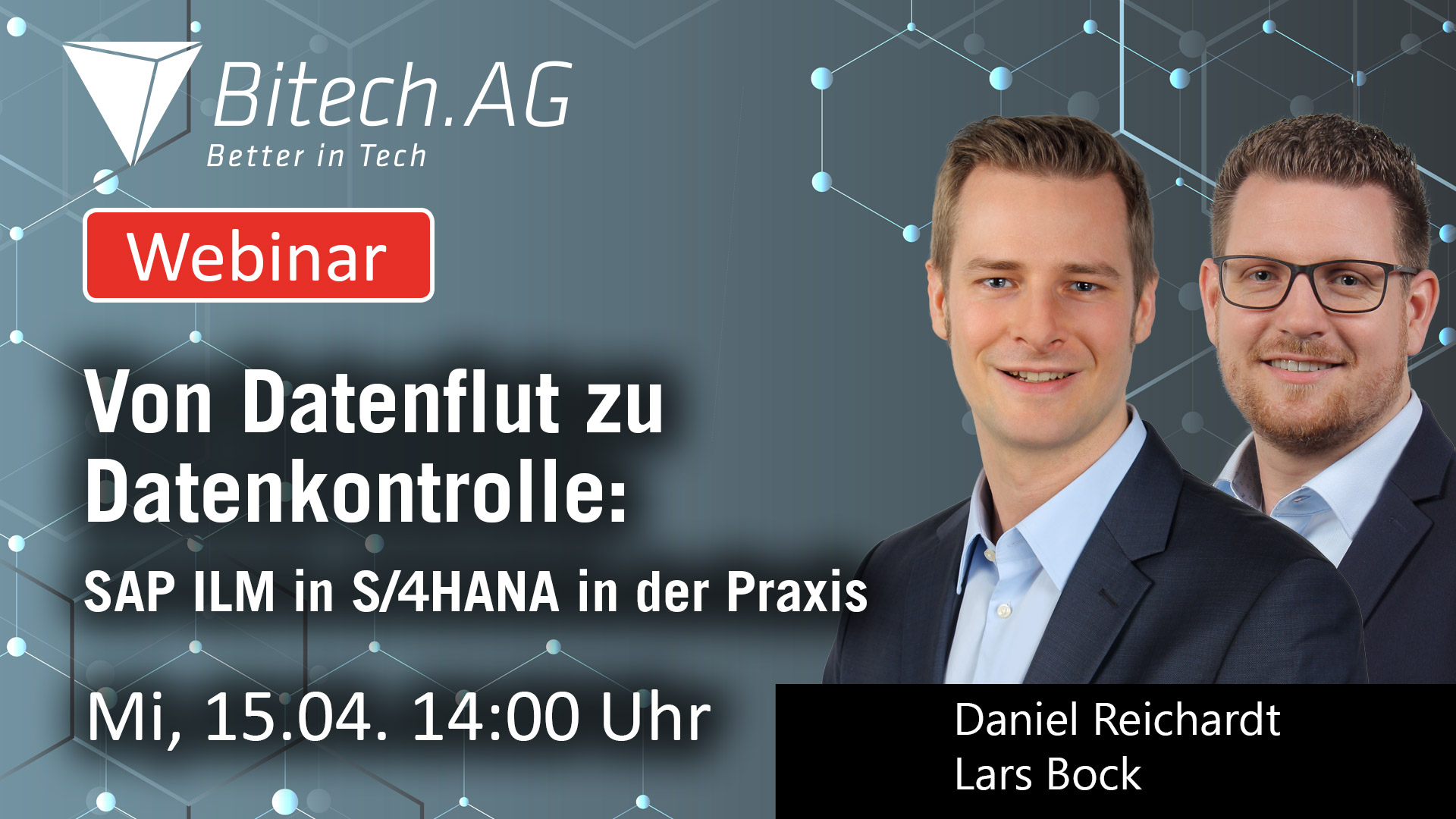 Am Mittwoch, 15. April ab 14:00 Uhr führen Sie Daniel Reichardt und Lars Bock durch unser Webinar „Von Datenflut zu Datenkontrolle: SAP ILM in S/4HANA in der Praxis“. Die Teilnahme ist kostenfrei. Wir freuen uns auf Sie!